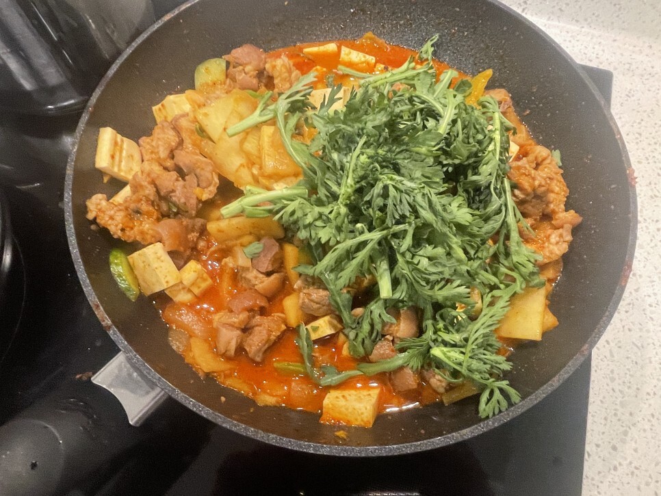 두부랑 집에 있던 쑥갓까지 확 넣어버립니다.
